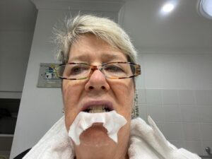 The procedure is done in a hospital because of the necessary supervision of the laser – but you are awake and it is quite noisy and you do have a little awareness of ‘burny flesh’. The secret to getting a good result is dressing the lip every two hours which is really why you need the time off work. I was diligent with this and between the Repairase and the bathing and cleaning of the lip wounds and applying the vaseline-soaked dressing, my lip started to heal quite quickly. Despite the initial pain, I did manage to eat much sooner than I had expected, because due to my sheer love of eating, I quickly worked out how to do it without pain. Straws, food cut into little pieces, no spicy food, drinks and food luke warm only and that was the day I stopped eating any salt in my food.