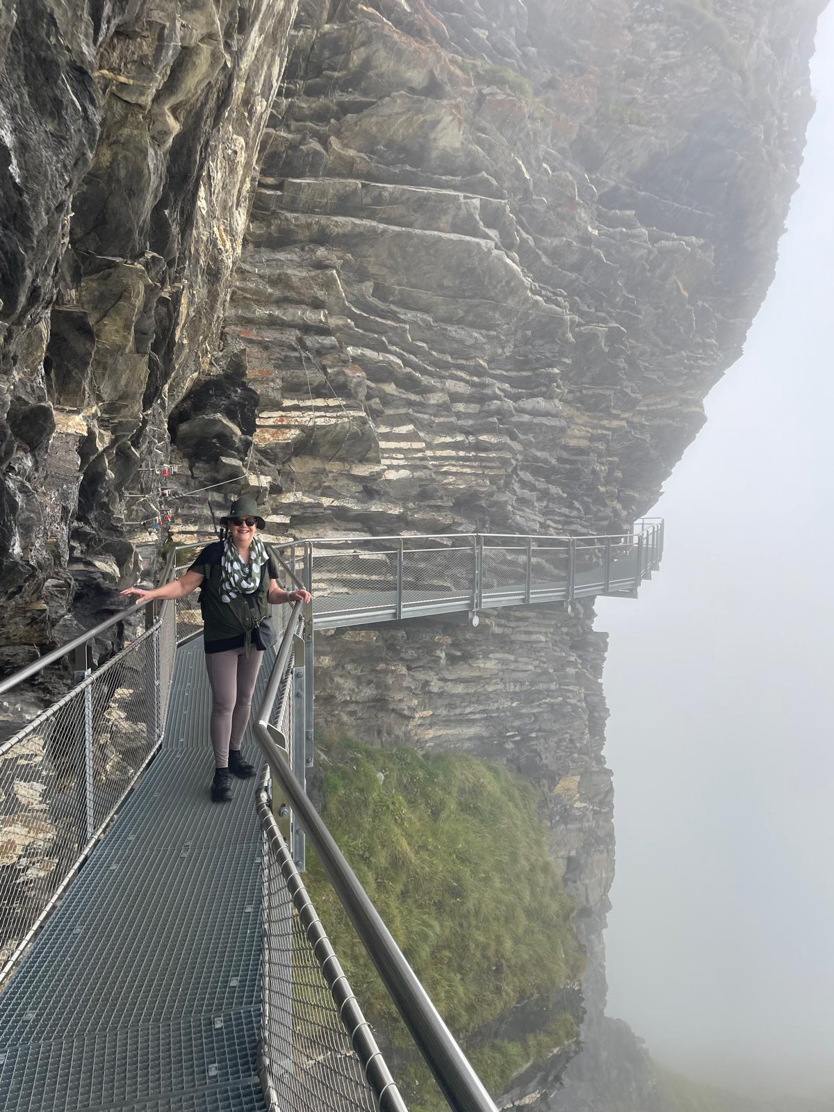 We had planned to take the gondola to First and then hike from First to Bachalpsee (46mins, 100m up). We did the First Cliff Walk which as you can see from the photos was shrouded in cloud (which meant my usual fear of heights was completely obliterated). We then attempted to go up the Bachalpsee walk for about 30 mins, but the cloud was impossibly dense and there was no view anywhere and we made the call to turn around and head much lower down to see if we could see some views.