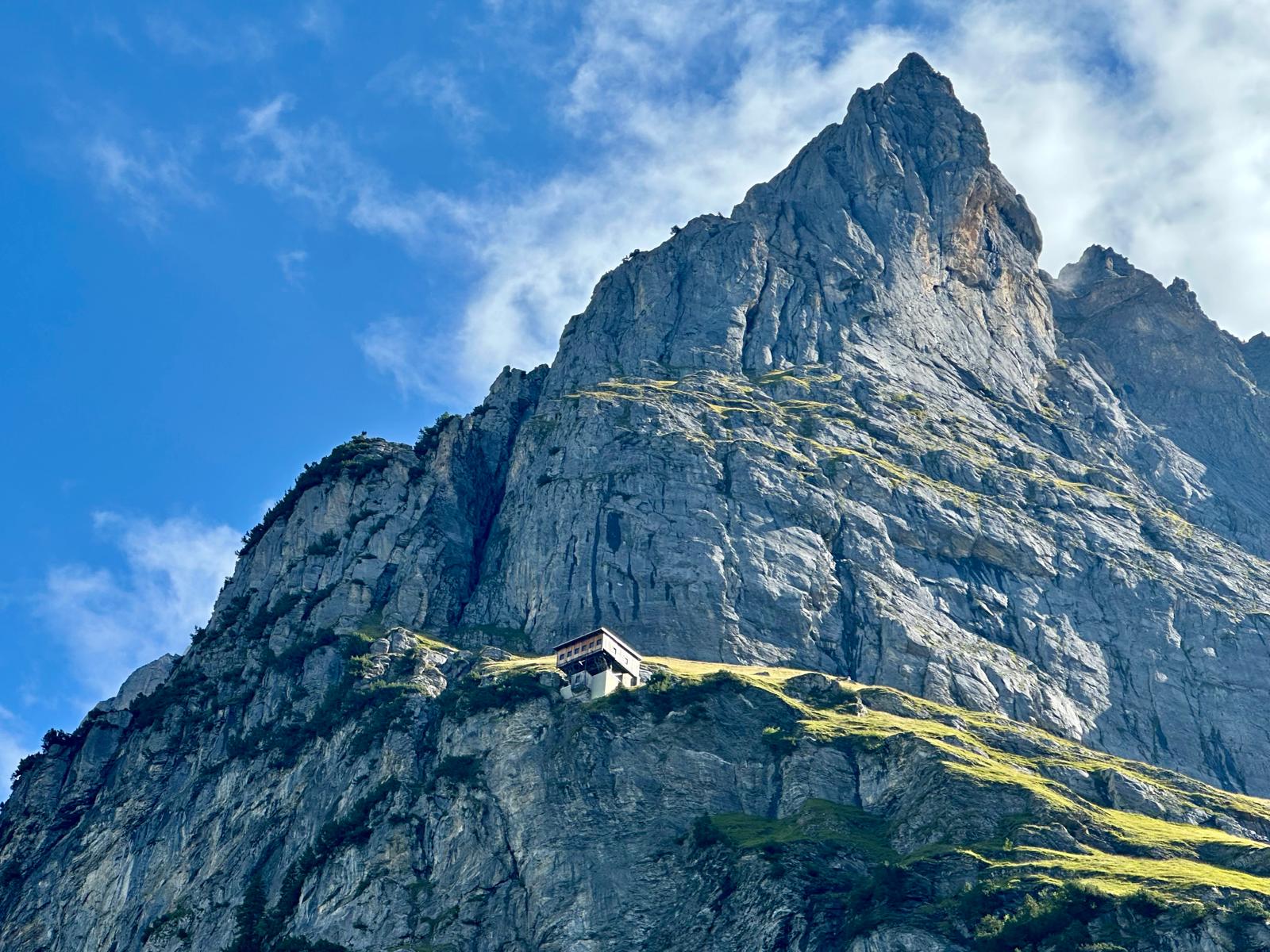 As we approached the Milchbach Hutte (which was closed), the spectacular view of the Glacier Valley suddenly appeared and it was breathtaking. The sun was catching the glistening rock face and it was hard to look away. Perched on a precarious edge high up on the rock face was a building which we thought was a Rifugio for intrepid climbers, but actually is the remnants of first mountain station of the first cable car on The Wetterhorn Mountain – called Enge Mountain Station. First built in 1908, it ceased operations in 1915 following a lack of tourists during the war. There is a replica of the cabin at the Wetterhorn Hotel where our walk finished. Its position makes you wonder how on earth it was built!