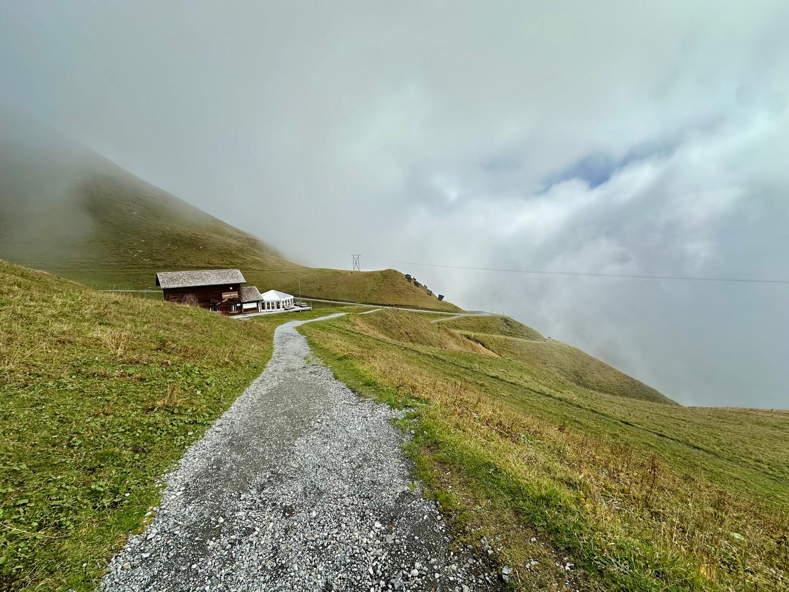 We had planned to take the gondola to First and then hike from First to Bachalpsee (46mins, 100m up). We did the First Cliff Walk which as you can see from the photos was shrouded in cloud (which meant my usual fear of heights was completely obliterated). We then attempted to go up the Bachalpsee walk for about 30 mins, but the cloud was impossibly dense and there was no view anywhere and we made the call to turn around and head much lower down to see if we could see some views.